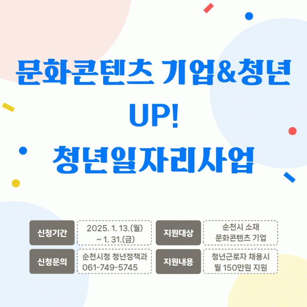 지원사업에 선정된 문화콘텐츠(애니메이션) 분야 중소기업이 미취업 순천청년을 신규 채용할 경우, 인건비를 매월 최대 150만 원(최대 10개월)까지 지원한다.