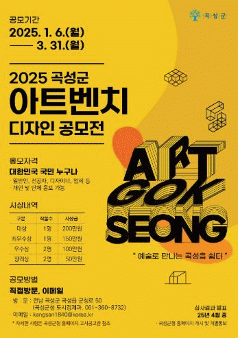 군관계자는 “이번 공모전을 통해 지역의 정체성을 반영한 아름답고 기능적인 벤치 디자인을 기대하며, 많은 참여를 통해 곡성의 매력을 한층 더 높일 수 있기를 바란다”라고 전했다.