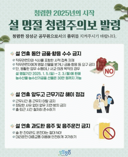 장성군은 청사 전광판 홍보와 함께 민원실 입구에 ‘설 명절 선물 안 주고 안 받기’문구가 적힌 입간판을 세운다. ‘청렴주의보’ 카드뉴스도 제작해 내부 게시판에 게재한다.
