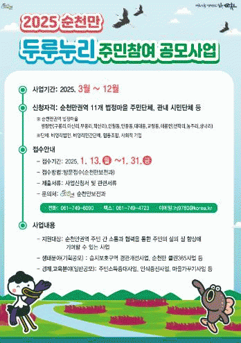 시 관계자는 “순천만 두루누리 공모사업은 순천만 관광수익을 순천만 보전 활동을 하는 주민들에게 환원해주는 사업이다”며 “주민이 스스로 기획하고 참여하여 항구적인 순천만 보전과 주민 삶의 질 향상에 기여할 수 있기를 바란다”고 말했다.