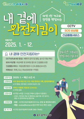 서구는 주거형태, 주변환경을 고려해 관내 여성 1인 가구 및 여성 한부모가족, 범죄피해 여성 140여 명을 선정해 서비스 이용료(월 9900원)를 지원할 예정이다.