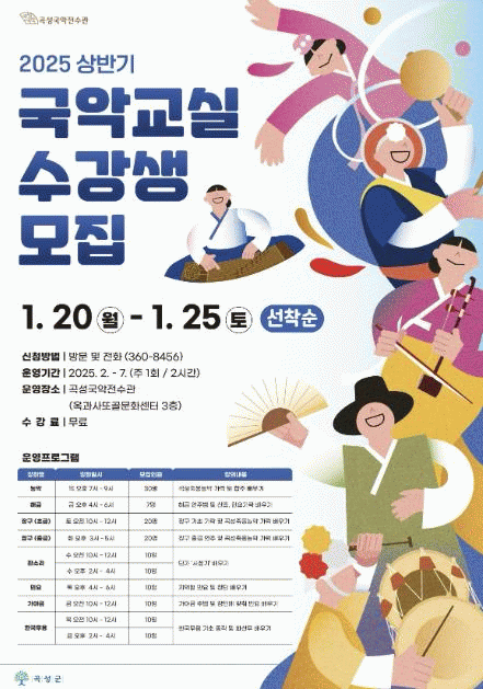 ‘2025년 상반기 국악교실’은 오는 2월 3일부터 7월 26일까지 총 25주 과정으로 운영된다. 운영 장소는 곡성군 옥과면 사또골문화센터 3층에 있는 곡성국악전수관이다.