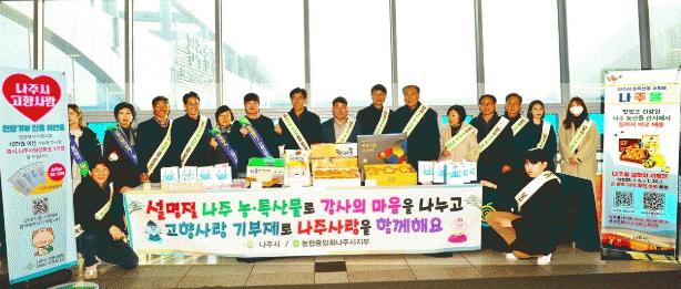 행사에는 나주시 김성기 농축산식품국장, 농협중앙회 나주시지부 제해중 지부장을 비롯한 시청 및 농협 관계자 등이 참석해 농산물 꾸러미를 송정역 이용객들에게 직접 나눠주며 나주의 뛰어난 농업 경쟁력과 특산물의 우수성을 알렸다.