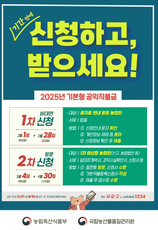 신청은 2월 1일부터 2월 28일까지 비대면(온라인)으로 가능하며, 3월 1일부터 4월 30일까지는 농지소재지 읍면동 주민센터를 직접 방문해 신청하면 된다.