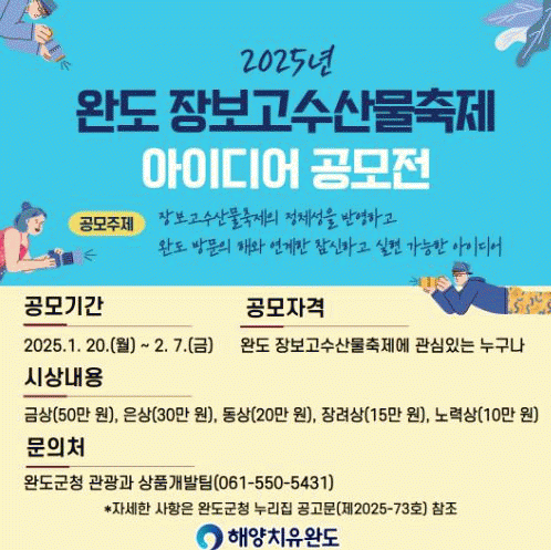 오현철 관광과장은 “공모전을 통해 장보고수산물축제에 대한 관심이 높아지고 축제의 경쟁력을 강화할 수 있는 아이디어가 많이 발굴되길 기대한다”라고 전했다.