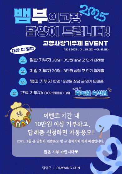이뿐만 아니라, 푸른 뱀의 해를 맞아 추가로 뱀띠 기부자 10명을 추첨해 답례품을 증정할 예정이며, 추첨을 통해 100만 원 이상 고액 기부자 3명에게는 ‘죽녹원 1박 숙박권’의 혜택도 제공한다.