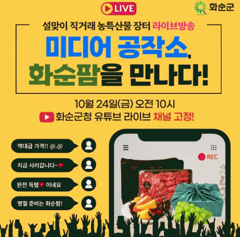 이번 라이브 방송은 직거래 장터에 참여하는 16개 업체의 판매 상품을 화순군청 유튜브 채널을 통해 실시간 방송으로 홍보하며, 화순팜 홈페이지를 통해 시청자들이 직접 상품을 구매할 수 있도록 진행될 예정이다.