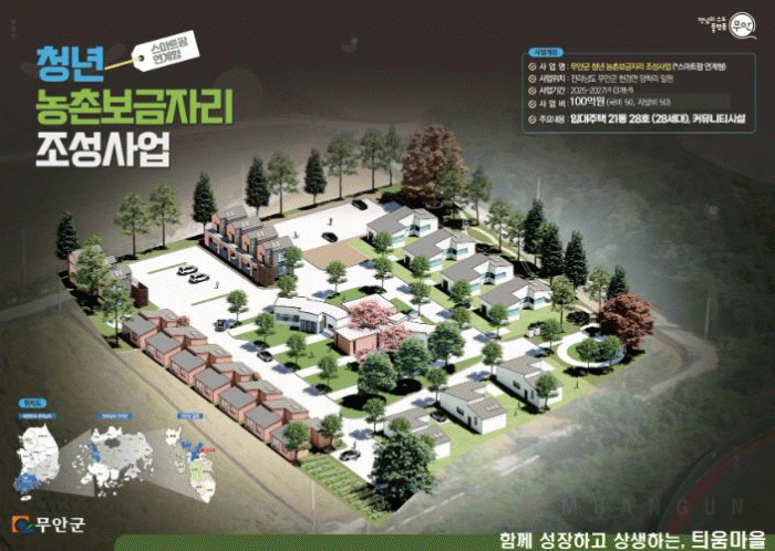 무안군은 3년간 국비 50억원을 포함한 총 100억원을 투자해 ‘함께 성장하고 상생하는 틔움마을’을 조성하여 28가구의 청년 주거 공간을 마련할 계획이다.
