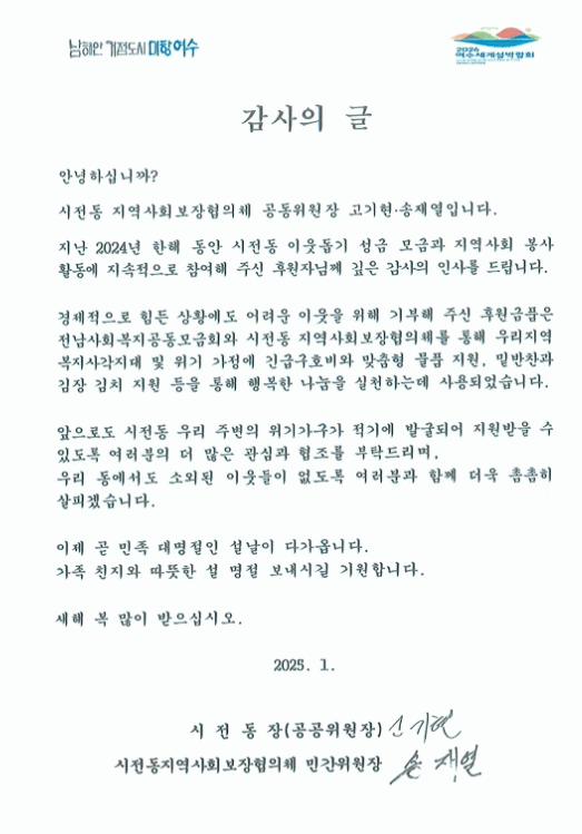 시전동에 따르면 서한문에는 나눔에 적극 동참해 준 후원자와 지역 내 위기 가정을 묵묵히 살핀 명예사회복지공무원의 노고에 대한 감사, 변함없는 관심을 당부하는 내용이 담겼다.