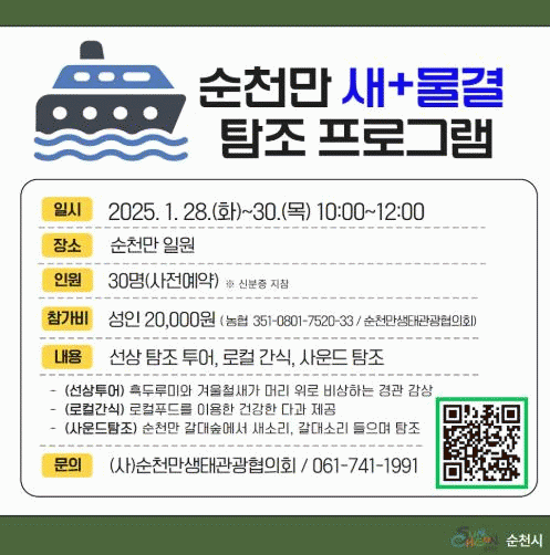 시 관계자는 “설연휴 기간 동안 순천만습지에서 자연과 철새들의 군무를 감상하며, 특별한 탐조 참가를 통해 무한한 힐링을 만끽하시길 바란다”고 말했다.