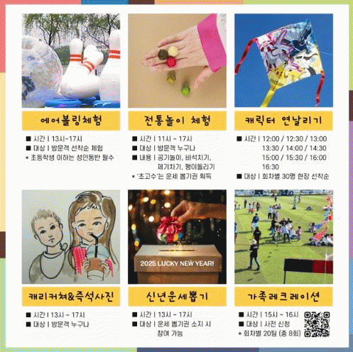프로그램은 매일 11시부터 17시까지 운영되며, ▲에어볼링 게임 ▲캐릭터 연날리기 ▲신년 운세 뽑기 ▲캐리커처 등 가족 단위 방문객들이 함께 즐길 수 있도록 체험 위주의 행사로 진행된다.