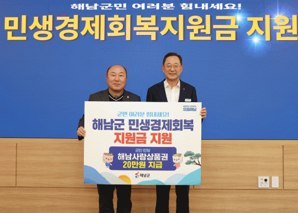해남군은 경기 침체가 지속됨에 따라 지난해 연말부터 민생경제회복지원금 지급 방안을 꾸준히 검토했으며, 박지원 국회의원, 해남군의회 등과 긴밀한 협의를 계속해 왔다. 1월에는 민생경제회복지원금 지원 조례 제정에 착수해 2월 군의회 개원과 함께 조례 제정과 예산 심의를 거쳐 2월까지는 지급을 완료한다는 계획이다.