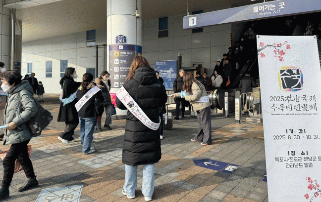 고향을 찾는 귀성객에게 홍보 물품과 함께 따뜻한 환영인사를 전하고, 올해 개최될 수묵비엔날레의 일정 및 장소 등을 안내했다.