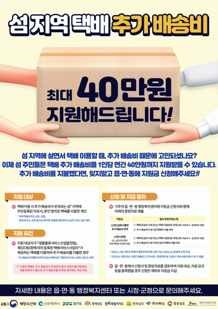 특히 올해는 해수부 공모로 선정된 11개 소외도서(9개 항로) 뱃길 운영을 본격적으로 추진해 그동안 교통편이 없던 섬 주민의 불편을 해소할 예정이며, 택배 추가 비용 지원사업 제도 개선으로 육지와 연륙된지 10년이 넘은 섬에도 택배 추가 비용을 지원할 계획이다.