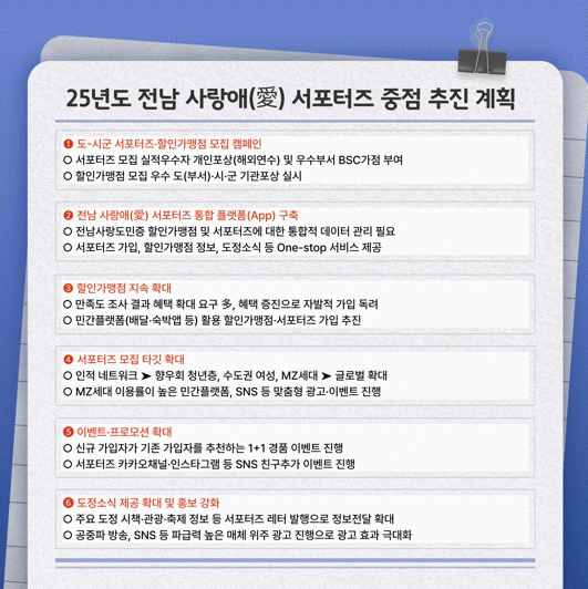 특히 ‘전남 사랑애 서포터즈 통합 플랫폼(앱)’을 구축해 서포터즈 가입, 할인가맹점 정보 제공, 도내 축제·행사 안내, 도정 소식 등 다양한 서비스를 원스톱으로 제공해 편의성을 증진할 계획이다.