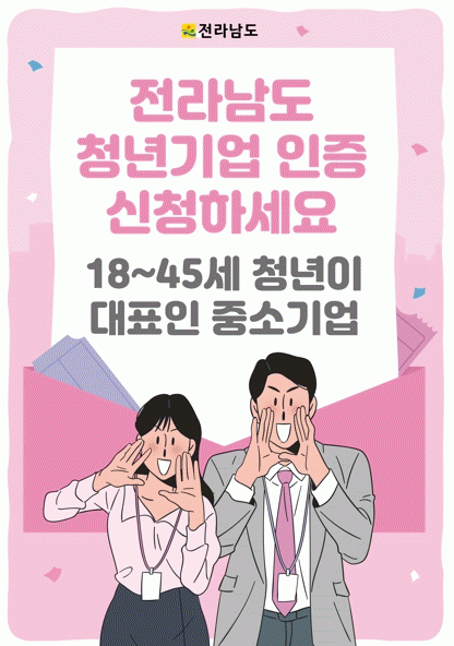 청년기업 인증은 전남에 소재하고 중소기업기본법 기준에 의한 중소기업이어야 하며 18~45세의 청년(2007~1979년생)이 대표인 기업 중에 국세 및 지방세 체납이 없고, 현재 정상적으로 운영 중인 기업이면 인증받을 수 있다.