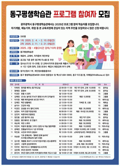 참여를 원하는 주민은 오는 10일까지 평생학습관에 방문·접수하거나 모바일 앱 ‘동구 두드림’을 통해 온라인 신청하면 된다. 기타 자세한 사항은 동구 평생학습관으로 문의하면 된다.