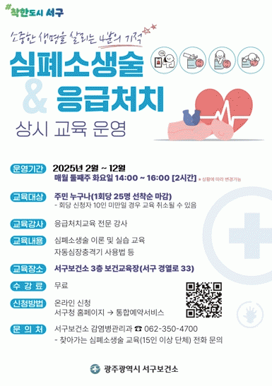 심폐소생술 상설교육은 회차당 25명으로 구성하여 진행되며 매달 두 번째 화요일, 오후 2시부터 4시까지 서구보건소 3층 보건교육장에서 무료로 실시한다. 접수는 서구청 통합예약 홈페이지를 통해 온라인 신청이 가능하며 서구보건소 감염병관리과로 문의하면 된다.