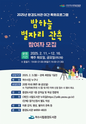 참여를 희망하는 시민은 2월 3일부터 관측 희망일 1일 전까지 여수시립도서관 누리집에서 신청하면 되며, 단체는 별도의 참가 신청서를 작성해 1주일 전까지 신청하면 된다.