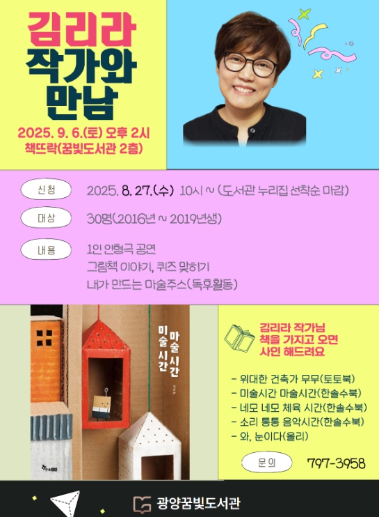 9월 6일 열리는 김리라 작가와의 1차 프로그램은 6세부터 초등학교 3학년까지 참여할 수 있으며, 참가 신청은 8월 27일부터 광양시립도서관 누리집을 통해 받는다.