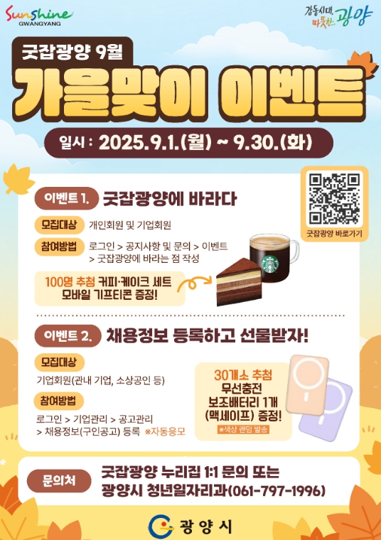 ‘굿잡광양’ 누리집을 통해 참여할 수 있으며, 당첨자는 10월 1일 누리집을 통해 발표한다.