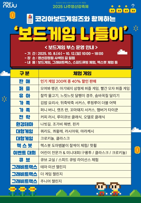 한편 ‘보드게임 나들이’ 프로그램의 자세한 일정과 내용은 나주영산강축제 공식 블로그와 SNS 채널을 통해 확인할 수 있다.