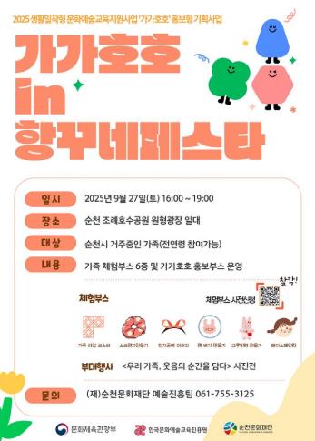 순천문화재단 관계자는 “지난 6월 행사에서 시민들의 높은 참여와 관심을 느낄 수 있었다”며, “이번‘가가호호 in 항꾸네페스타’에서도 가족과 함께 마음을 나누며 추억을 만드는 소중한 시간이 되길 바란다”고 전했다.