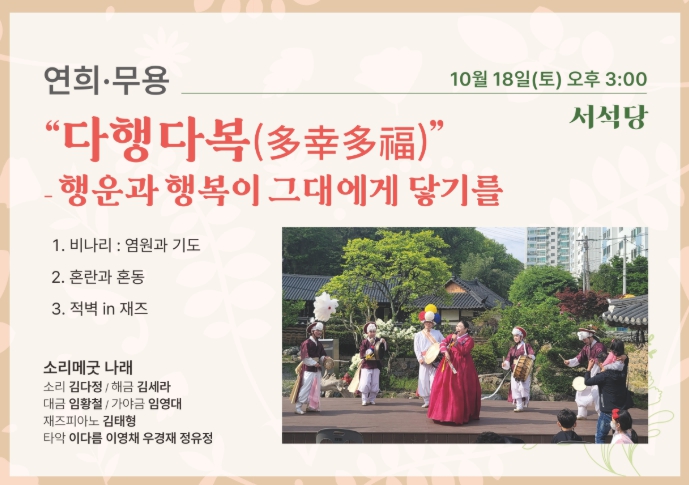 '다행다복(多幸多福)'은 국악의 깊이와 재즈의 즉흥성이 어우러진 융합 공연으로, 혼란 속에서 희망을 찾아가는 여정을 음악으로 풀어낸다.