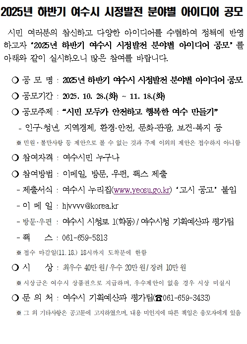 이번 공모는 “시민 모두가 안전하고 행복한 여수 만들기”를 주제로 인구·청년, 지역경제, 환경·안전, 문화·관광, 보건·복지 등 전 분야에 걸쳐 참신한 아이디어를 공모한다.