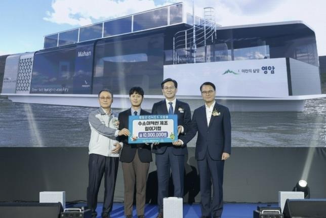 지난달 30일 영암군민의날 행사에서 ㈜빈센, (유)이원마린, ㈜마스토볼트코리아영암은 수소여객선 제조를 기념하는 의미로 영암군 천사펀드에 1,000만원을 기부했다.