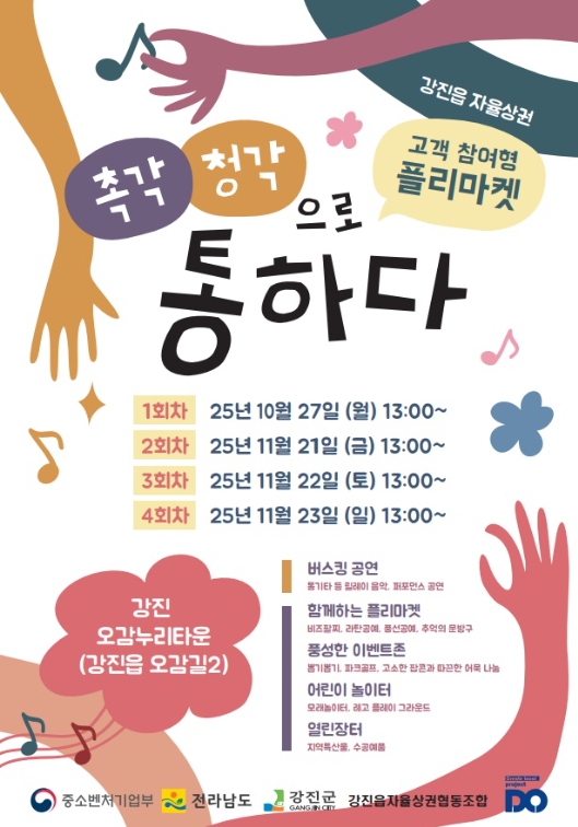 강진읍 자율상권협동조합 김동수 이사장은 “이번 행사는 강진읍 중심상권의 활력을 높이고, 청년과 상인이 함께 성장하는 지역 경제 모델을 만드는 계기가 될 것”이라며 “군민과 방문객 모두 즐겁게 참여해 지역 상권 활성화에 힘을 보태주길 바란다”고 말했다.