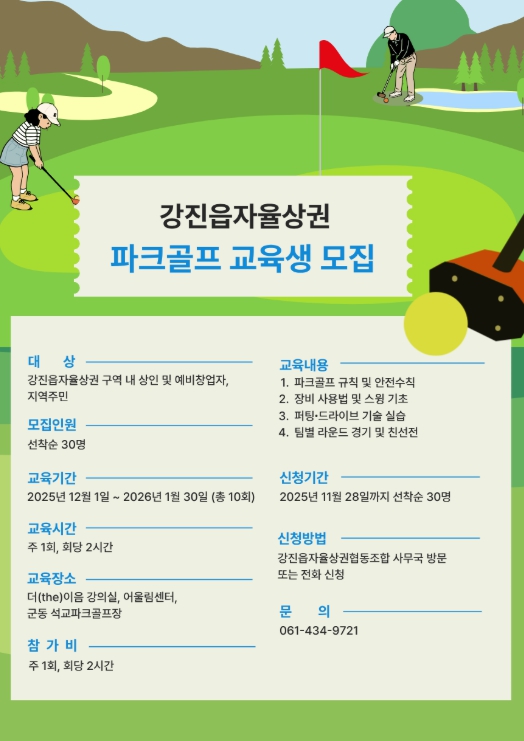 이번 교육은 상인 간 친목을 다지고 지역 공동체 문화를 확산시키기 위한 ‘상인 힐링 여가사업’의 일환으로 추진된다. 교육을 수료한 참여자들을 중심으로 파크골프 동호회 결성도 추진해, 지속적인 교류와 자율적 활동을 이어갈 계획이다.