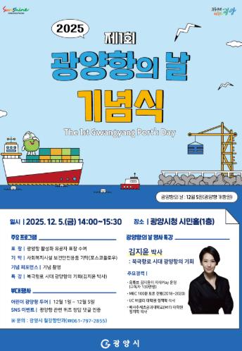 광양시는 기념일을 맞아 시 공식 SNS 계정을 통해 ‘광양항의 날’ 퀴즈 이벤트를 운영하고 있으며, 여수광양항만공사와 협력해 12월 1일부터 4일까지 관내 어린이집을 대상으로 ‘어린이 광양항 투어’도 실시할 계획이다.