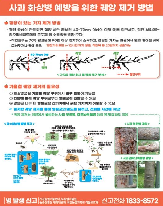 특히 동계 정지·전정 시 사용하는 가위·톱 등 작업도구와 장갑을 통한 전염 가능성이 큰 만큼, 작업 전·후 소독을 반드시 실시하고 절단면에는 방제약제를 도포해 추가 감염을 예방해야 한다.