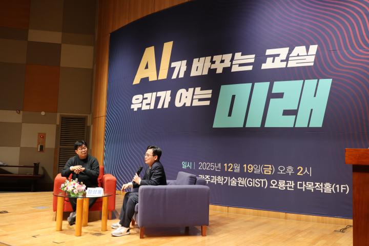 | | 19일 오후 광주과학기술원(GIST) 오룡관에서 열린 ‘AI가 바꾸는 교실, 우리가 여는 미래’ 사제 토크콘서트에서 뇌인지과학 분야 석학인 정재승 KAIST 교수(왼쪽)와 그의 중학교 시절 스승인 정성홍 전 광주시교육감 민주진보단일후보가 AI 시대 인재의 요건과 광주 교육의 과제에 대해 대담을 나누고 있다. |