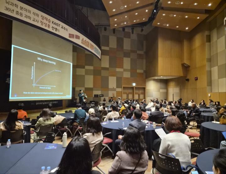 | | 19일 오후 광주과학기술원(GIST) 오룡관에서 열린 ‘AI가 바꾸는 교실, 우리가 여는 미래’ 사제 토크콘서트에서 정재승 KAIST 교수가 '인공지능시대 뇌과학으로 미래교육을 성찰하다'를 주제로 강연하고 있다. 이날 행사는 미래 교육에 관심을 가진 시민ㆍ학생 200여 명이 객석을 가득 메워 열띤 분위기 속에 진행되었다. |