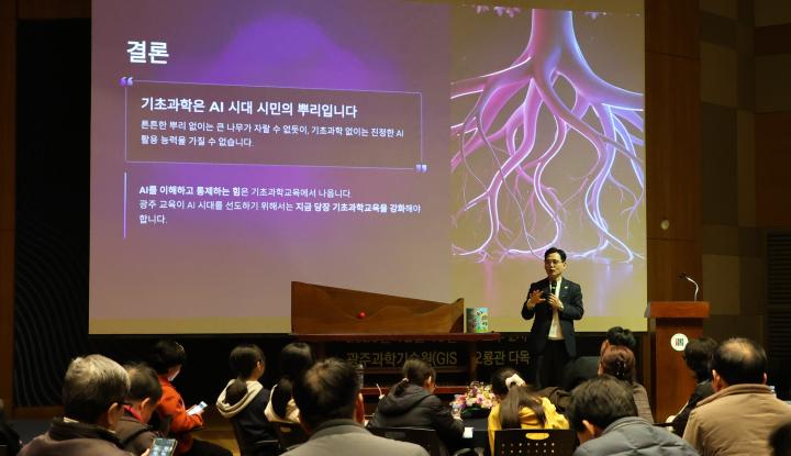 | | 19일 오후 광주과학기술원(GIST) 오룡관에서 열린 ‘AI가 바꾸는 교실, 우리가 여는 미래’ 사제 토크콘서트에서 정성홍 전 광주시교육감 민주진보단일후보가 'AI 시대, 미래교육을 다시 묻다'를 주제로 강연하고 있다. 이날 행사에는 추운 날씨에도 불구하고 미래 교육에 관심을 가진 시민과 학생 200여 명이 객석을 가득 메워 열띤 분위기 속에 진행되었다. |