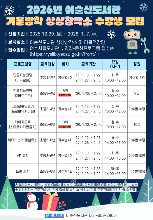 강좌별 10명 내외 수강생을 선착순으로 모집하며, 참가 희망자는 여수시립도서관 누리집에서 본인 또는 보호자가 신청하면 된다. 기타 자세한 사항은 이순신도서관으로 문의하면 된다.