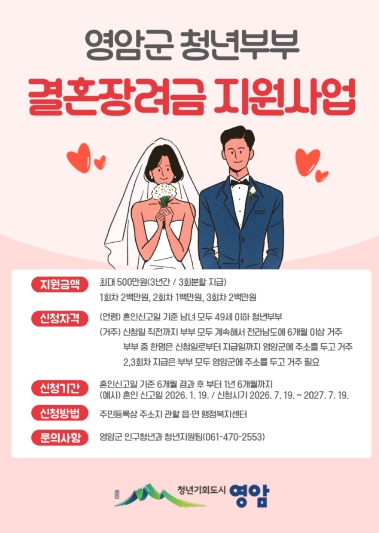 김선미 영암군 인구청년과장은 “결혼장려금 지원이 청년층의 결혼 초기 경제 부담을 덜고, 지역 내 안정 정착에 도움을 주도록 하겠다”고 말했다.
