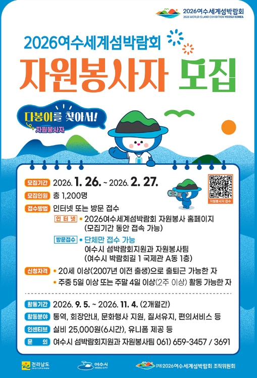 한편, 섬박람회 자원봉사자 신청은 홈페이지를 통해 온라인으로 신청할 수 있으며, 활동에 참여한 ”다봉이“에게는 1일 6시간 기준 활동 실비 2만 5천 원이 지급될 예정이다.