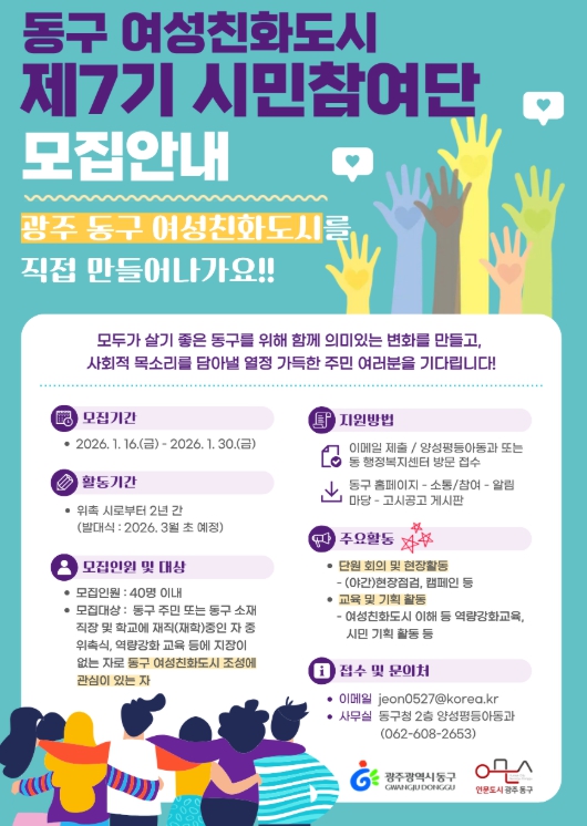 제7기 여성친화도시 시민참여단 신청은 동구청 양성평등아동과 또는 동 행정복지센터를 통해 이메일·방문 접수로 할 수 있으며, 기타 자세한 사항은 동구청 누리집 공고문에서 확인할 수 있다.