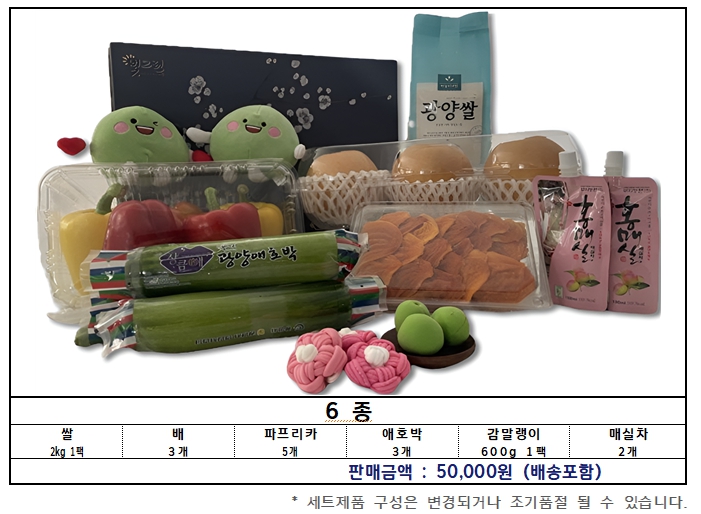 이번 선물세트는 광양에서 생산된 우수 농특산물로 ▲쌀 ▲배 ▲파프리카 ▲애호박 ▲감말랭이 ▲매실차 등 6개 품목으로 구성됐으며, 배송비를 포함해 5만 원에 판매된다.