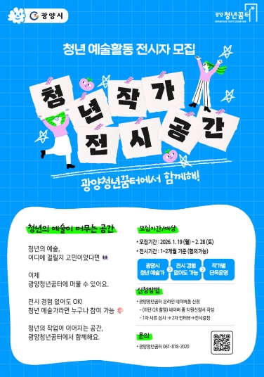 작품 전시를 희망하는 청년은 광양청년꿈터 누리집 및 누리 소통망(SNS)을 통해 관련 내용을 확인하거나, 광양청년꿈터로 문의하면 된다.