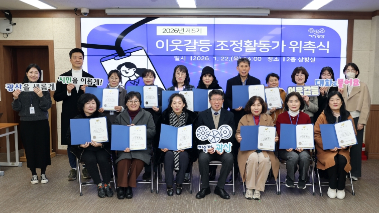 광산구 관계자는 “이웃갈등 조정활동가를 중심으로 일상에서 벌어지는 갈등으로 어려움을 겪는 주민들을 돕겠다”라며 “체계적인 교육과 주민 의견을 바탕으로 활동가 전문성을 높이고 주민이 체감할 수 있는 갈등 조정 서비스를 제공할 것”이라고 말했다.
