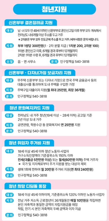 이 밖에도 ▲청년 취업자 전세·월세 지원(월 20만 원, 최대 1년) ▲신혼부부·다자녀 가정 보금자리 지원(주택 구입 대출이자 3년간 지원) ▲청년 희망 디딤돌 통장 사업(월 10만 원 매칭 적립, 3년) ▲청년 문화복지카드 지원(연 25만 원) ▲청년 생활공구 무료 대여 사업 등을 통해 주거와 자산 형성, 생활 편의를 종합적으로 지원하고 있다.