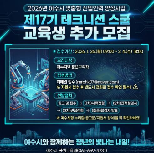 테크니션 스쿨 제17기 교육생 추가 모집과 관련한 자세한 사항은 여수시 평생교육과로 문의하면 된다.