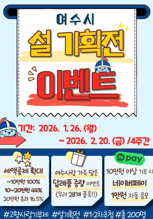 여수시 관계자는 “설 명절을 맞아 경품 추첨과 다양한 답례품 증량 이벤트를 정성껏 준비했다”며, “2월 20일까지 이어지는 이벤트를 통해 더 많은 분들이 고향 사랑을 실천하고 알찬 혜택도 받아 가는 즐거운 명절이 되시길 바란다”고 전했다.