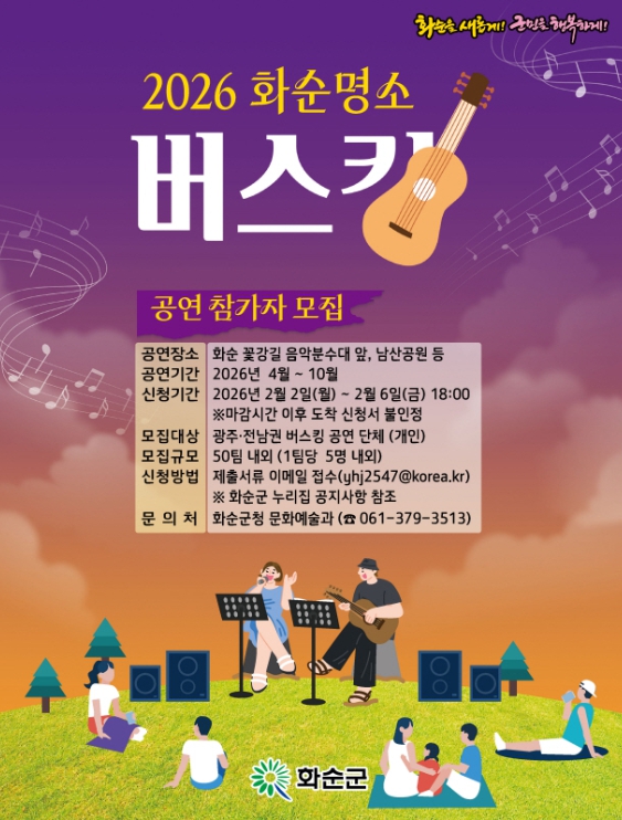 신청을 희망하는 참가자는 화순군청 홈페이지 공고문을 참고해 참가 신청서를 작성하고, 최근 1년 이내 공연영상을 함께 제출해야 한다.