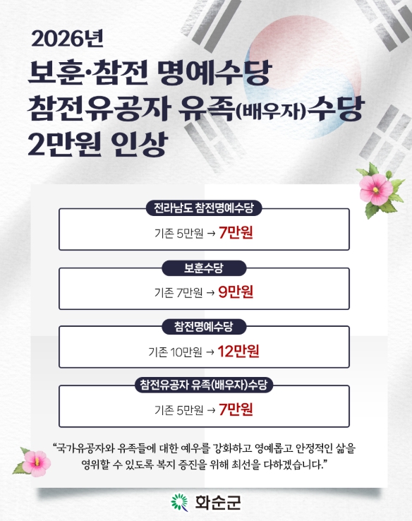 이번 인상 대상은 ▲화순군 보훈수당 ▲화순군 참전명예수당 ▲화순군 참전유공자유족(배우자)수당 ▲전라남도 참전명예수당 등으로 각각 매월 2만 원씩 인상된다.
