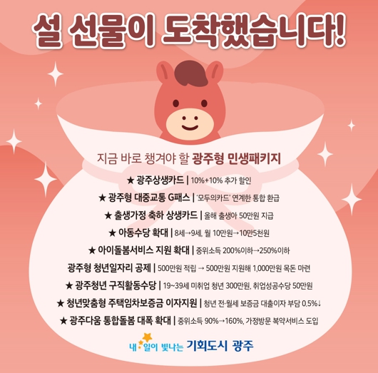 ▲광주상생카드 할인 혜택을 비롯해 ▲광주형 대중교통비 지원 지(G)-패스 ▲출생가정 축하 상생카드 ▲광주청년 구직활동수당 ▲청년맞춤형 주택임차보증금 이자지원 ▲광주형 청년일자리 공제 사업 ▲광주다움 통합돌봄 등 광주시민들이 바로 챙기면 좋을 정책들이다.